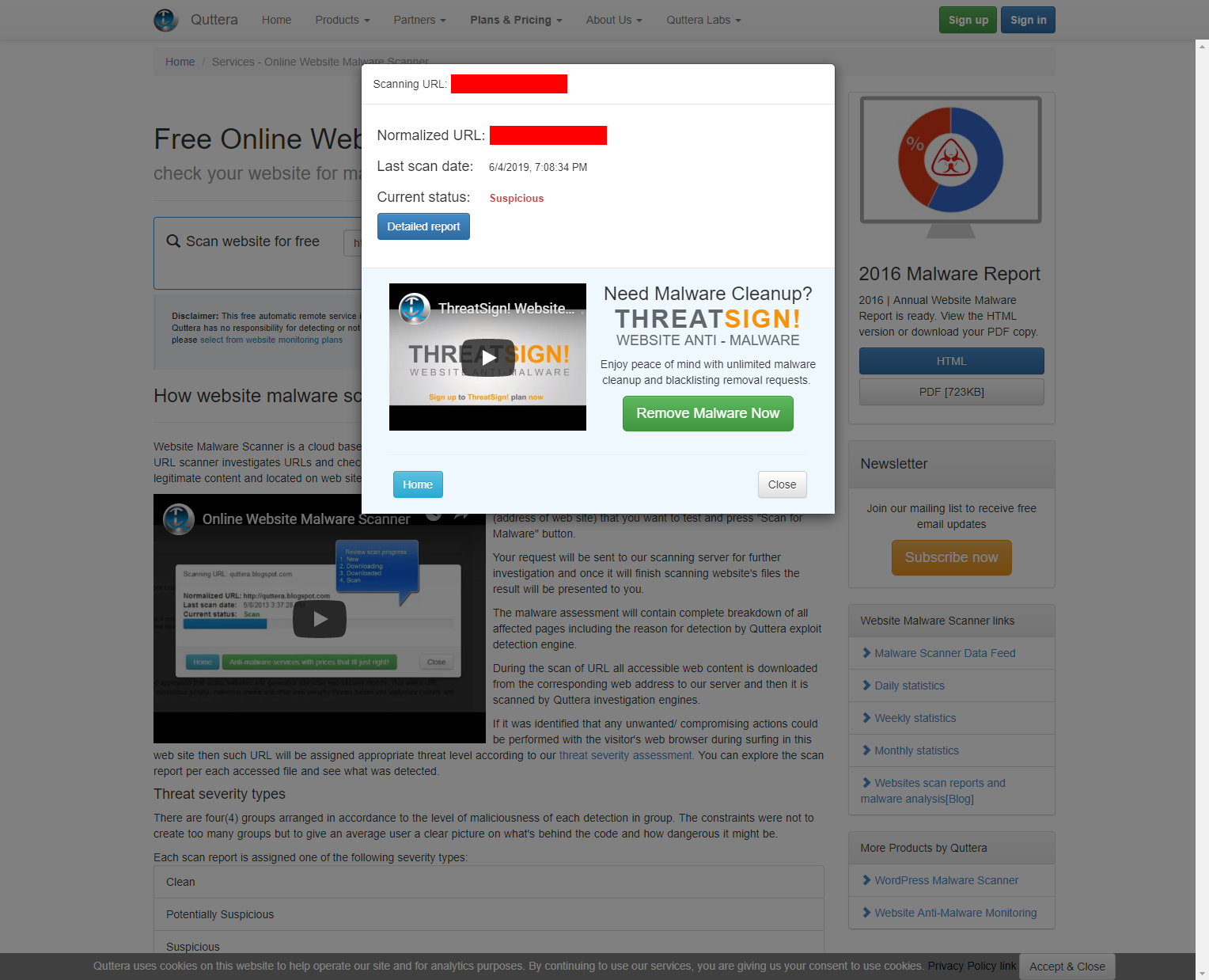 Quttera‘s results were inconsistent. The website was first rated as clean. Shortly afterwards, it was classified as suspicious in a second scan:
