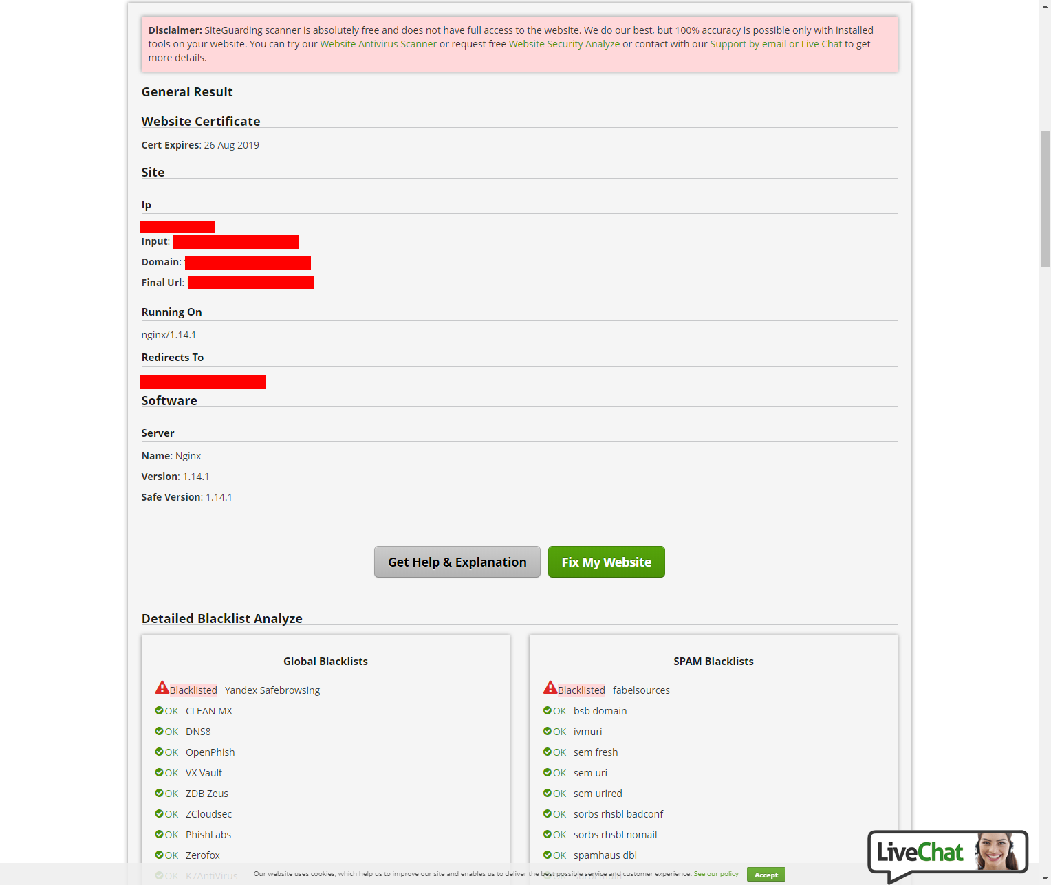 All that SiteGuarding’s malware scanner tells us is that the website was already blacklisted by Yandex Safebrowsing. Note: This scan and the second Sucuri scan were executed several hours after the other scans.